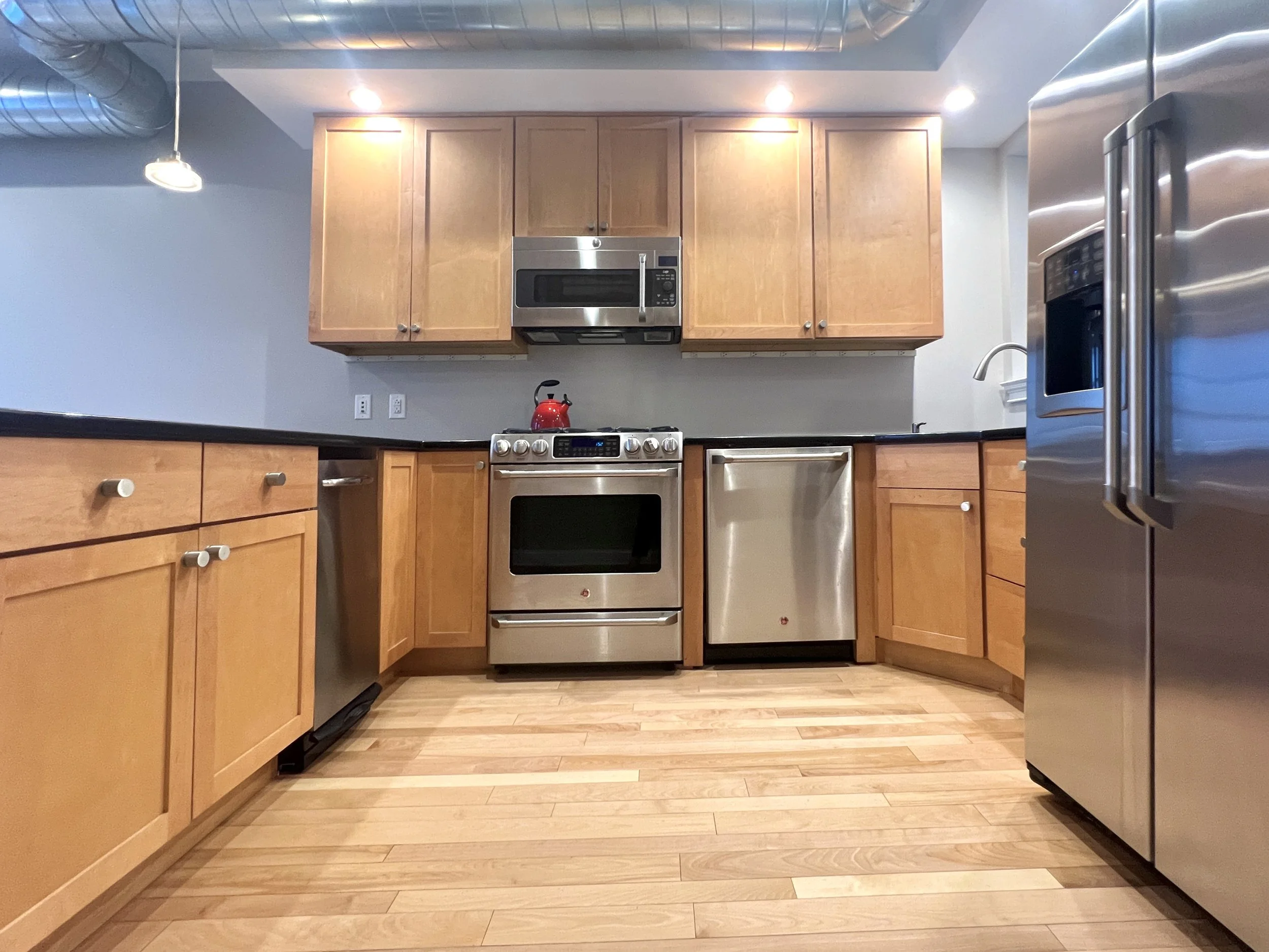 There's abundant light throughout and space to unwind or entertain; with a video intercom to buzz in your guests. The large kitchen has beautiful wood cabinetry and black stone counters that pair nicely with the oak hardwood floors. Included are stainless steel appliances, gas stove, and peninsula seating for four or five.